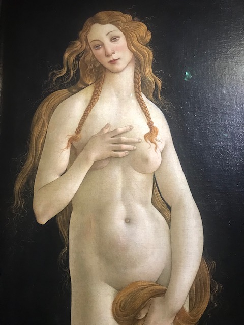 Comme elles sont belles les femmes de Botticelli (1445 – 1510), incarnation, à l’époque des Médicis et de la Renaissance italienne, de la beauté idéale. On peut admirer au fond d’une petite salle deux versions de Vénus, nue et pudique : l’une cachant d’une main, ses seins et de sa chevelure, son sexe et l’autre, recouverte d’un fin voile transparent qui la dévoile plus qu’il ne la recouvre. Deux grandes toiles prêtées par les musées de Berlin et Turin peintes sur fond noir, ce qui leur donne une dimension sculpturale. A côté, en provenance de Francfort, on découvre « La Bella Simonetta » dont la coiffure extrêmement sophistiquée est à elle seule un poème. Et encore, les extraordinaires et rares portraits exécutés par l’artiste, de Julien de Médicis et du poète guerrier Michele Marullo Tarcaniota.