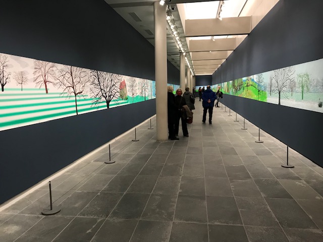 En même temps que l’exposition bruxelloise, le peintre britannique est aussi mis à l’honneur à Paris avec une installation monumentale de ses toiles réalisées à l’iPad pendant toute une année, lors de sa retraite (crise sanitaire oblige) dans la luxuriante Normandie : printemps, été, automne et hiver se succèdent sous nos yeux émerveillés par tant d’explosions de couleurs et de joie sous le soleil printanier suivies de celles de la pluie, des chatoiements de l’automne et du caractère plus gris et figé de l’hiver où les arbres semblent grelotter sous le froid et la neige. Impresssionnant.