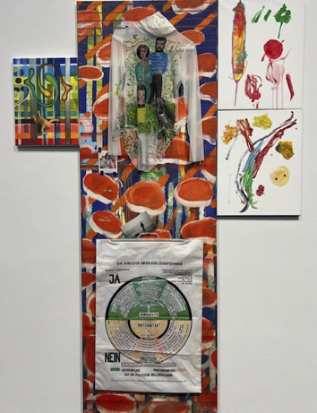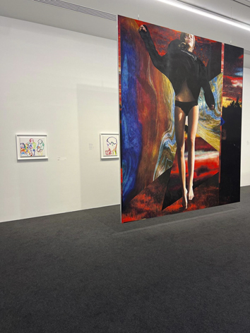 Beaucoup de références à l’histoire de l’art jalonnent le parcours de cette grande salle où déambuler parmi ces grands formats suspendus procure une sensation plutôt mitigée.