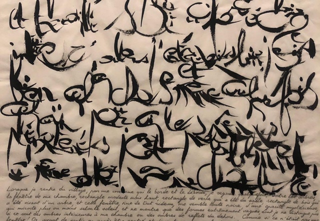 Passant au cours de ses tentatives graphiques du pastel coloré, à l’encre ordinaire, à l’encre de Chine appliquée à la plume, puis au pinceau jusqu’au tube lui-même sans plus d’intermédiaire, Dotremont recherche avant tout « l’unité verbale-graphique », celle d’un véritable cheminement qui part du lisible vers le visible pour aboutir au logogramme. Aboutissement d’un geste naturel qui devient expression poétique à part entière. Et il ne s’autorise aucune retouche. J’aime l’idée, le concept de peintures-mots. Il a commencé à le pratiquer dans les limites de la page avant d’adopter la position debout. Rappelons qu’il s’inscrit aussi naturellement à la suite de Guillaume Appolinaire et ses calligrammes, Fernand Léger, Picasso et Magritte, une génération qui s’est passionnée avant lui pour le signe scriptural. A la fois à la fois écrivain, poète, peintre, calligraphe, Christian Dotremont a aussi voyagé, donnant à son activité une dimension internationale. Sa renommée n’a malheureusement pas été à la hauteur de son talent et il reste encore trop méconnu, conséquence sans doute de son parcours atypique et de son refus d’appartenir à des catégories bien définies.