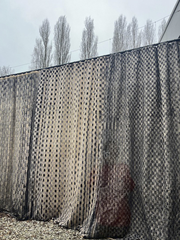 La pièce centrale de l’exposition est un magnifique et impressionnant rideau tissé localement, inspiré des motifs des kimonos japonais qui, au moment de l’explosion atomique ont été brûlés sur la peau des victimes d’Hiroshima. Le textile, à la fois doux et carbonisé évoque le moment où la bombe atomique a tout réduit en cendres. Il coupe la principale salle d’exposition en deux voire en 4, permettant un espace plutôt jour et un autre plutôt nuit et surtout, une division entre espaces intérieur et extérieur car il traverse le patio de part en part, tout en y rajoutant, une fois de plus, la notion de transformation, le passage du temps sur les objets.