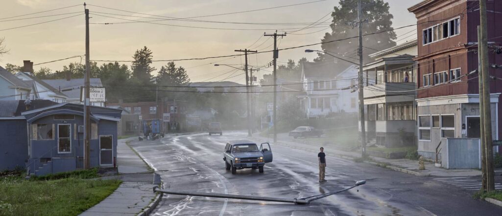 Bien que cette chronique paraisse tardivement, l’exposition « Eveningside » de Gregory Crewdson au Musée de la Photographie de Charleroi est une expérience que je qualifierais d’extraordinaire. Réunissant ses trois dernières séries majeures — Cathedral of the Pines, An Eclipse of Moths et Eveningside — cette rétrospective marque un point d’orgue dans la carrière d’un artiste qui me fascine depuis plus d’un quart de siècle, lorsque j’avais découvert ses tableaux photographiques en galerie, évoquant déjà la rigueur conceptuelle de Jeff Wall. Loin du militantisme direct, Crewdson dresse ici le constat puissant d’une société américaine en perte de repères, capturant avec une mélancolie crépusculaire le déclin des petites villes industrielles figées dans un silence troublant où l’humain semble irrémédiablement seul.