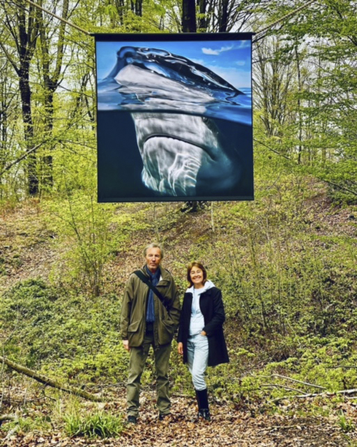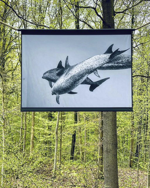 Vingt photos grand format sur le thème des fonds marins flottent au gré du vent, attachées aux troncs d’arbres par d’élégantes cordes de chanvre. Une immersion dans un monde inconnu, étrange, fascinant et une rencontre entre mer et terre, faune marine et flore terrestre, vert des feuilles et bleu des océans, celui du silence. Un univers pas toujours silencieux si on y réfléchit car y résonne non seulement le chant des baleines, les sifflements des dauphins mais encore le bruit des vagues. JMG nous révèle la profondeur des océans dans lesquels évolue sa compagne japonaise, enceinte de leur 2e enfant et munie de longues palmes très graphiques. Des clichés minimalistes souvent en noir et blanc qui donnent une touche unique, intemporelle, esthétique à ces rencontres entre l’homme et l’animal et les élèvent au rang d’œuvres d’art.